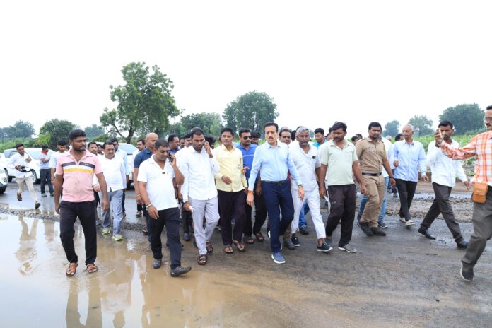 पाचोरा तालुक्यातील, शिंदाड, सार्वे बु., सातगाव या गावात अतिवृष्टीमुळे नुकसान झालेल्या भागाची पाहणी करताना मंत्री महाजन यांनी स्थानिक शेतकऱ्यांशी, गावकऱ्यांशी संवाद साधून त्यांच्या समस्या जाणून घेऊन त्यांना धीर दिला. ते म्हणाले, शासन पूर्णपणे आपल्या पाठीशी असून शासनतर्फे नुकसानी संदर्भात लवकरच मदत दिली जाईल असे त्यांनी यावेळी सांगितले.